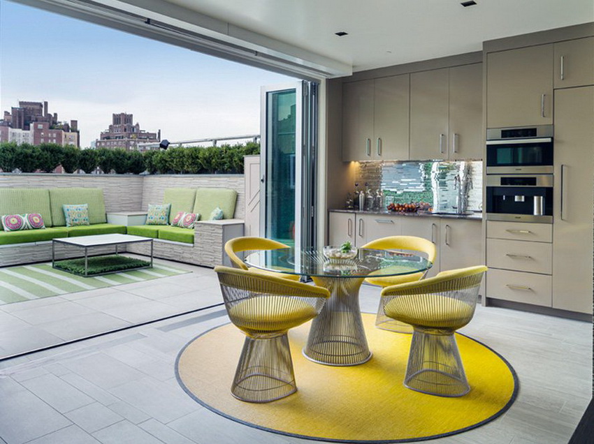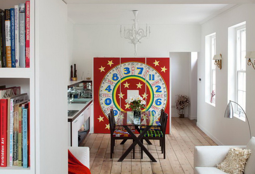 Pop art is a bright and progressive direction, therefore such an extraordinary and small product as a table with a glass top for the kitchen is optimal for this interior. Yellow, pink, blue, red and other bright colors of the countertop match this style perfectly.