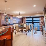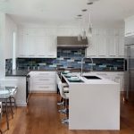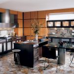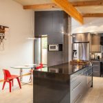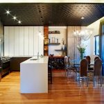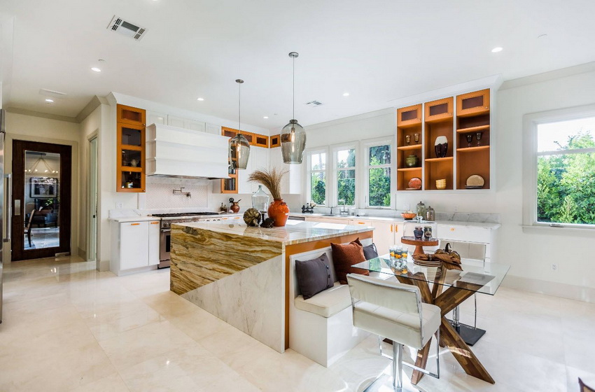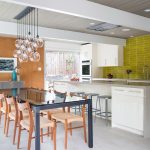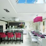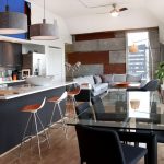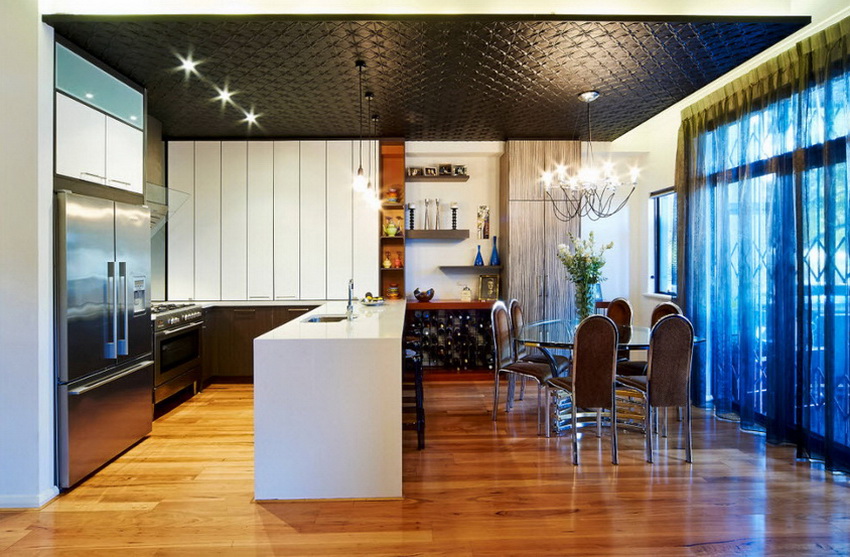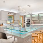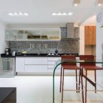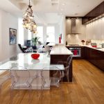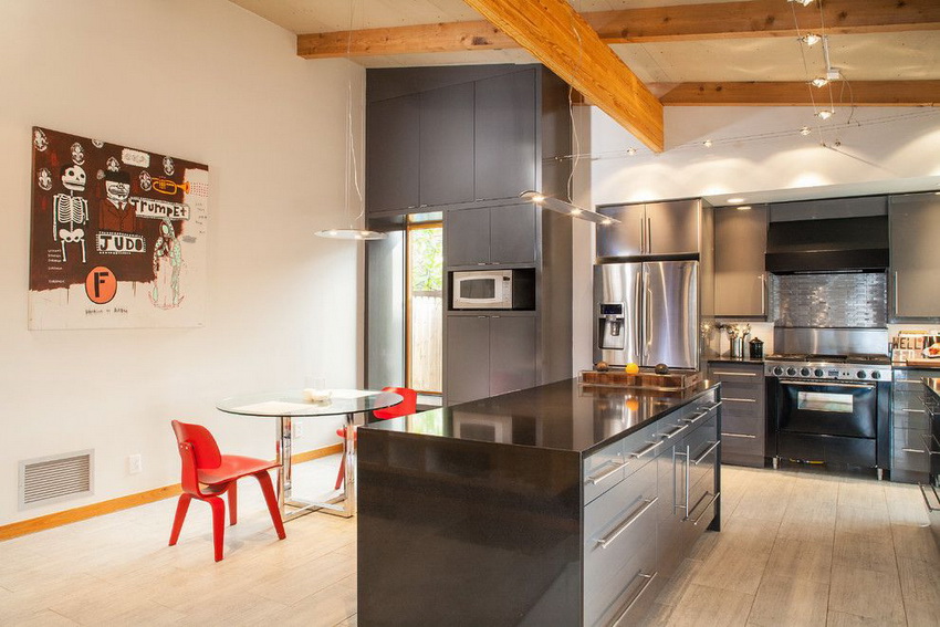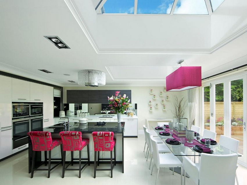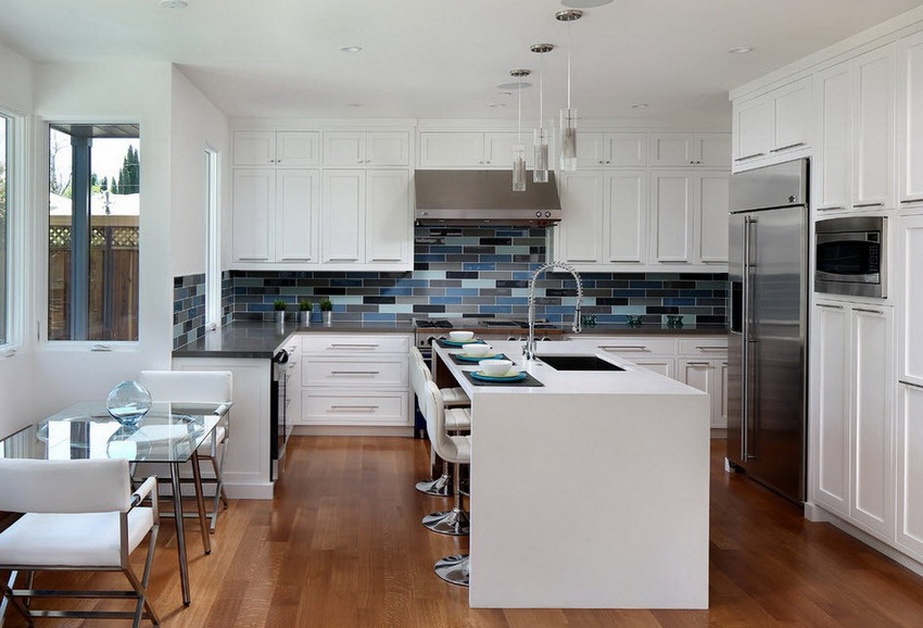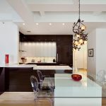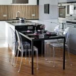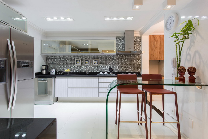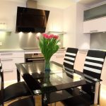 A transparent or white glass table in the kitchen is considered a universal option. Transparent and translucent constructions of saturated shades: orange, yellow, red, green, turquoise look spectacular and bright. Glossy black countertops give the kitchen a luxurious look.