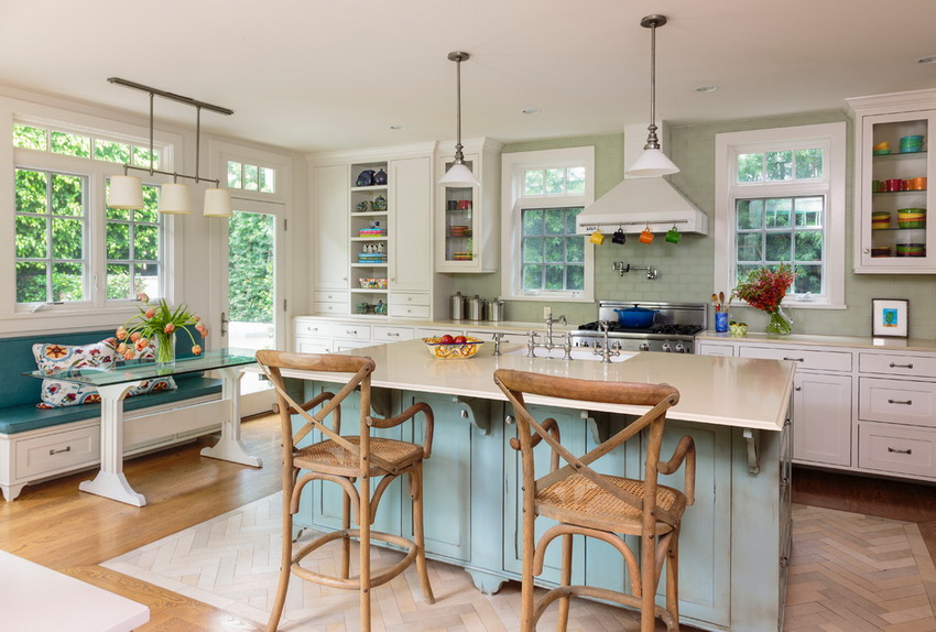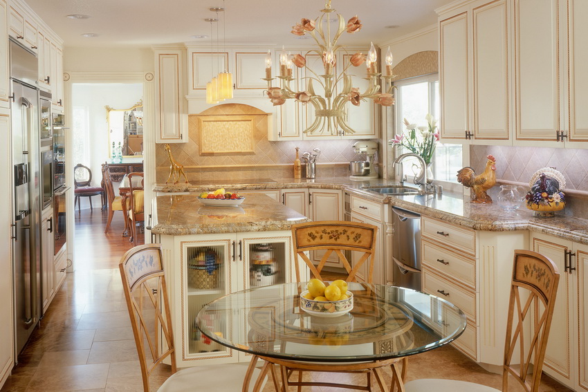 Country is a democratic direction, in which an unusual glass worktop will fit perfectly and create favorable conditions for working in the kitchen. This genre provides ample opportunities and allows you to implement absolutely any style and color ideas.