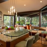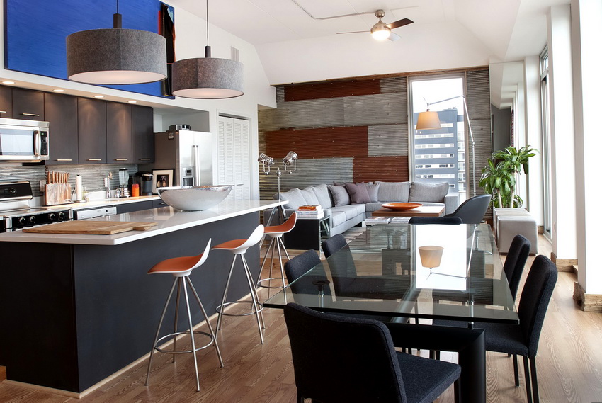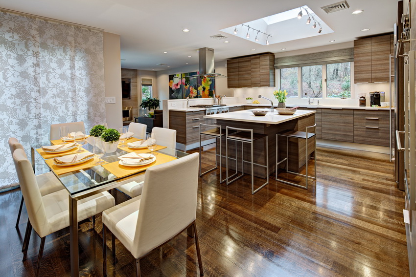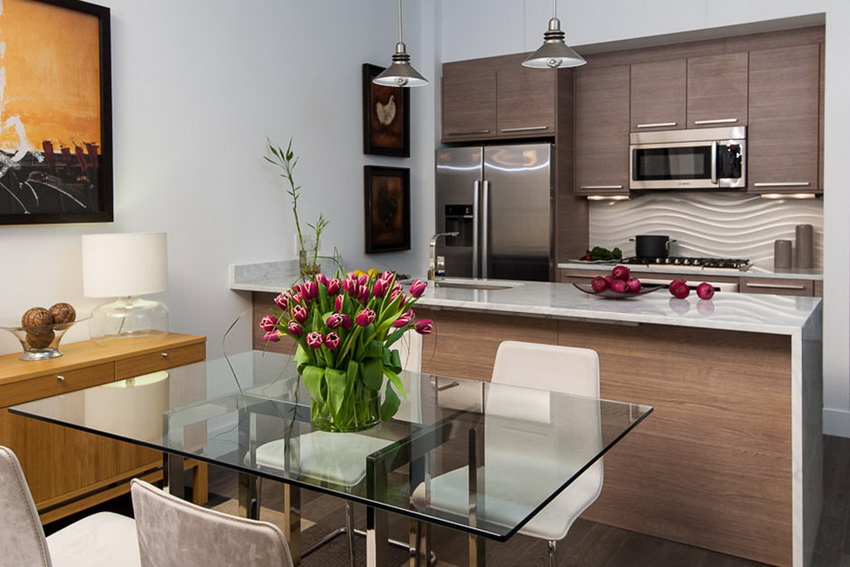 The combined group looks harmonious with a glass dining table for the kitchen, dining room and living room in a single studio space. The main thing is to buy a product made of high-quality materials and choose a form suitable for the interior.
