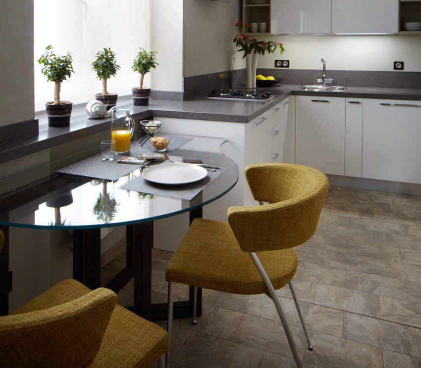 It is interesting! Glass kitchen tables are ideal for lovers of practicality and free space, and also an indispensable item for owners of small kitchens. Such products are easy to rearrange from place to place, which means that the table can be constantly moved from kitchen to living room and vice versa.