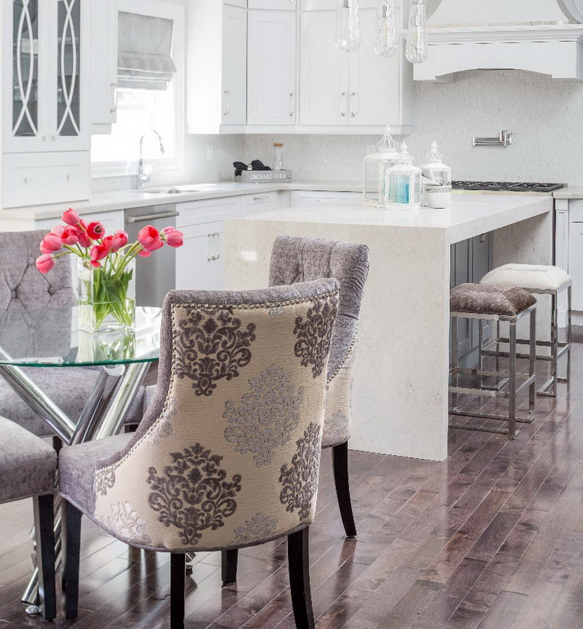 The combination of a glass table with exquisite high-quality chairs will add uniqueness. Such products diversify and decorate any kitchen or living room.