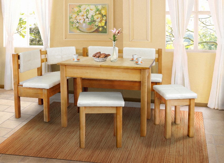 You should buy this furniture only after taking the appropriate measurements and drawing up a kitchen project. In the event that the dimensions of the kitchen do not allow installing a large table, you can purchase a folding model. A kitchen corner with a sliding table makes it possible to accommodate a large number of guests.