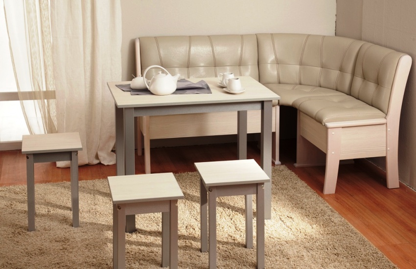 Popular are models that can transform into a sleeping place. Such designs are used in the case when it is necessary to organize a guest bed. The traditional set includes a corner itself, a table, and two seats in the form of stools.