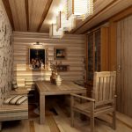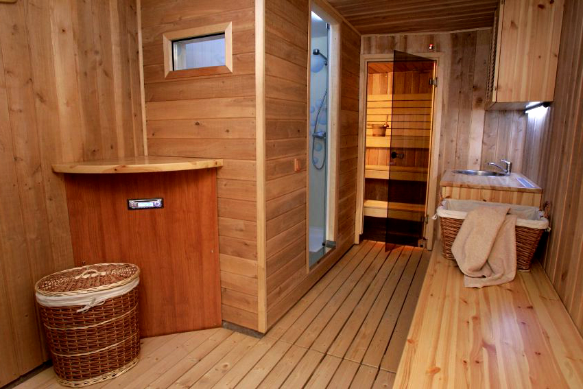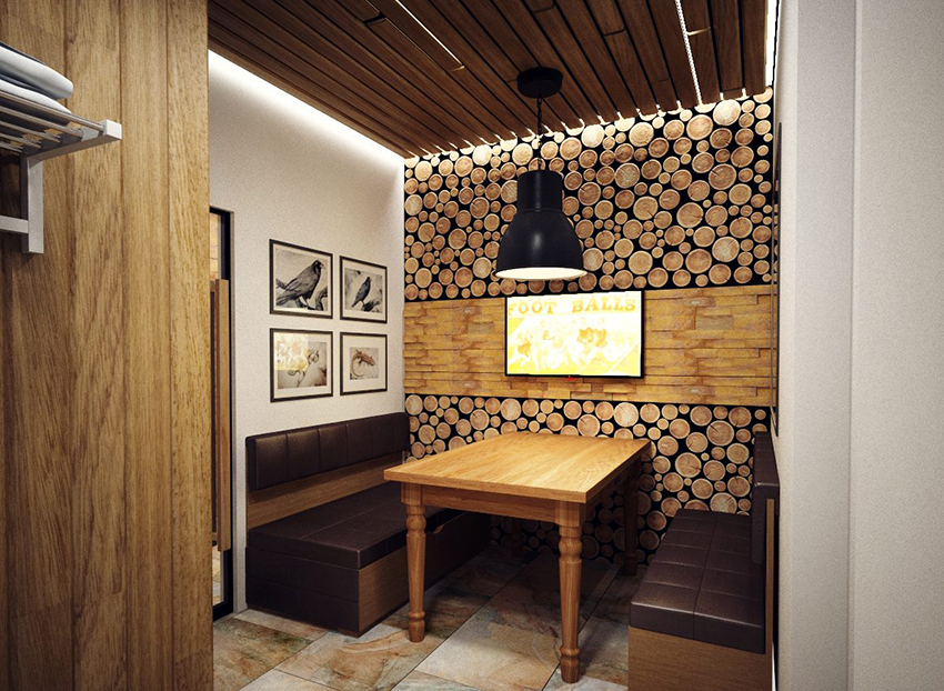 To make the overall impression of the bath pleasant, it is necessary to create an interesting interior already in the dressing room. It is desirable to make furniture from one type of wood. In the locker room, inexpensive pine will be quite acceptable. The main furnishings must be in the same color. You can use other shades, but only for decorating individual pieces of furniture.