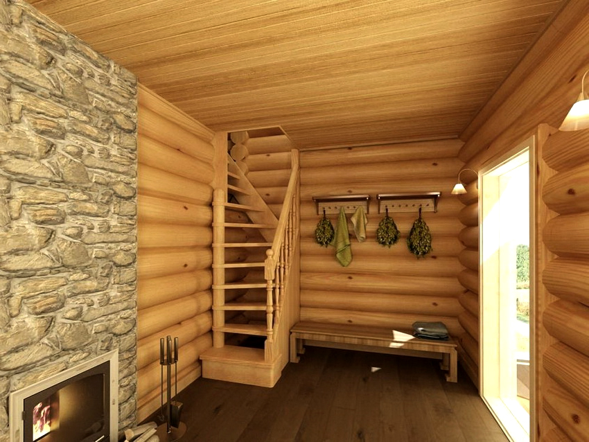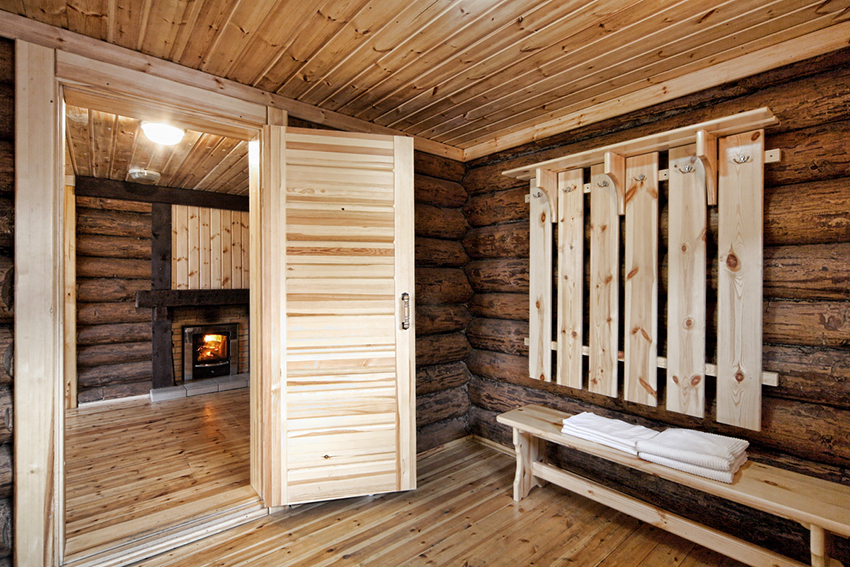 The first room of the bath is the dressing room. It can be used in many different ways. But one thing is invariable: it is located in front of the main rooms. Therefore, most often a dressing room is placed in it. In the dressing room, you need to equip a hanger or install a wardrobe (a combination of two options is possible), place a shelf for shoes.