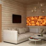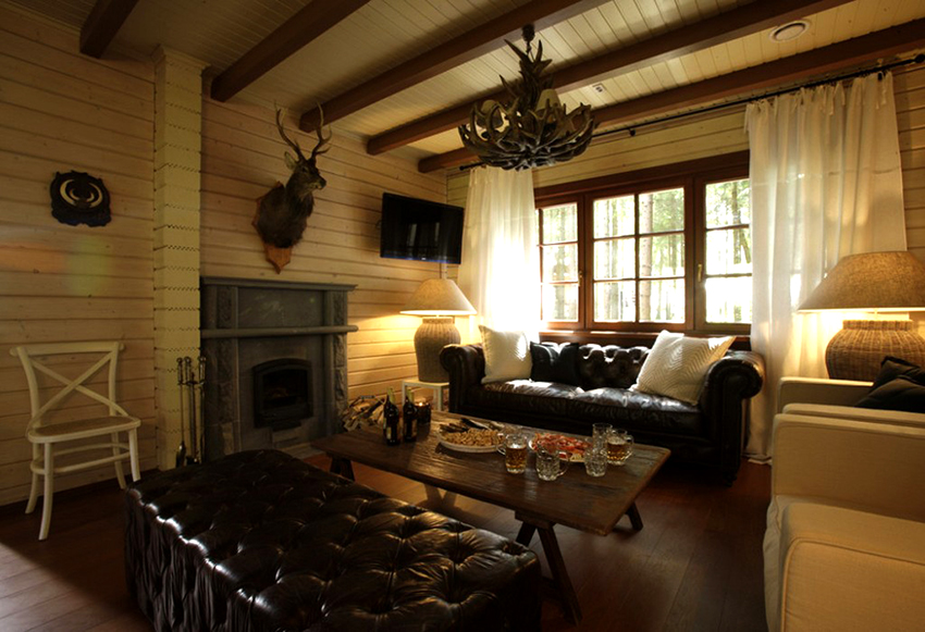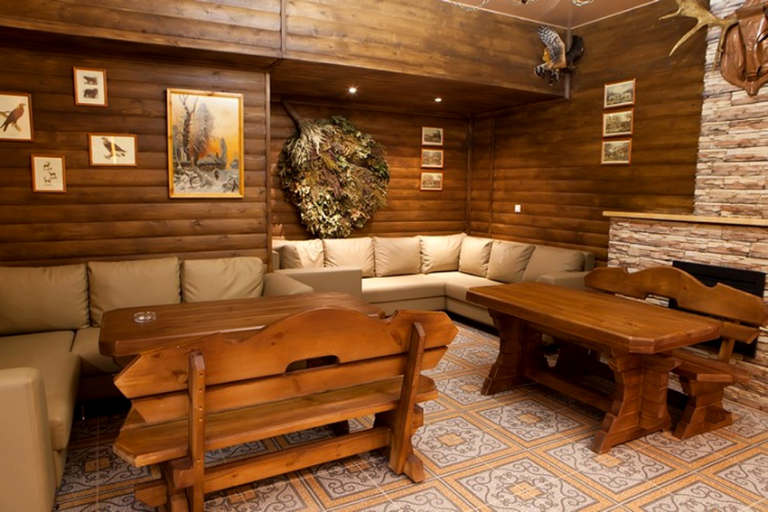 The basis of the interior design of the relaxation room in the bath is precisely the furniture. Wall decor, lighting fixtures, window blinds complement and highlight the chosen style.