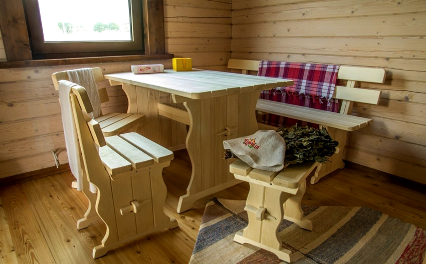 If there is no opportunity or inspiration for self-assembly, furniture for baths and saunas can be bought ready-made. Retail chains are full of a variety of models, ranging from crudely knitted stylized tables and benches to carved oak cabinets and designer rocking chairs. The choice primarily depends on the taste and availability of funds.