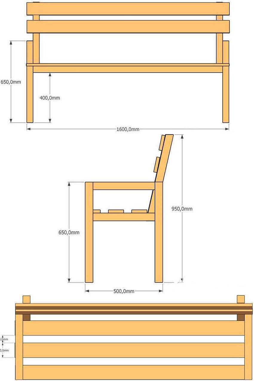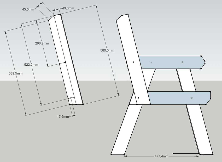 - Planks, fixing blocks, armrests, uprights and front legs must be trimmed at 90 °. The beams are laid at an angle of 45 °. Hind legs - at an angle of 11 °. On one side of the backrests, a 200 mm cut at a 5 ° angle is required.