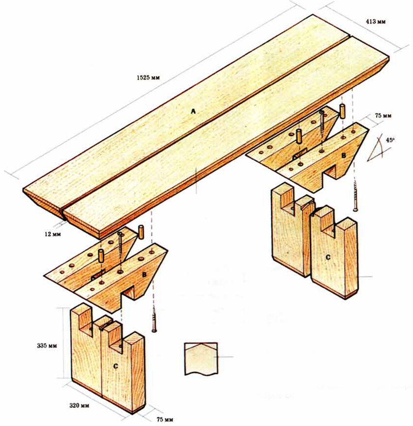 We make cruciform legs from bars 700 mm long. At the bonding point, you must first make a sample for the thickness of the bars and the depth of 25 mm, connect the legs with self-tapping screws. A bar is attached at the top, with the help of which the legs will be fixed to the seat board. Having retreated 100 mm from the inner edge (along the length) of the board, you need to attach the legs to it. Then it is necessary to strengthen the structure with a 900 mm bar, laying it in the x-shaped joints of the legs. All fasteners should be made with self-tapping screws.