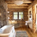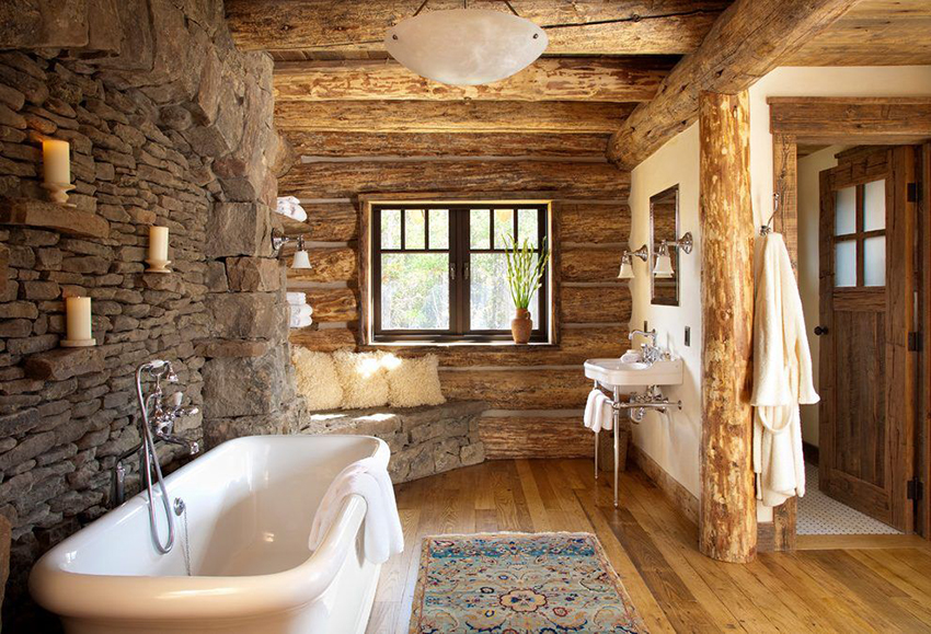 If the design of the furniture is simple and modest, it makes sense to decorate the interior of the rest room in the bath with wall panels made of natural material, towels, shelves with dishes and other details.