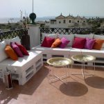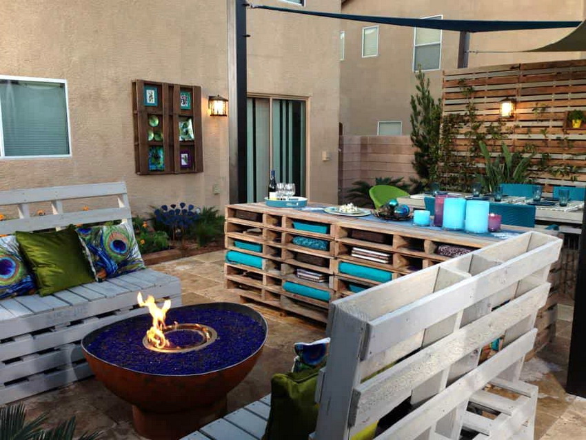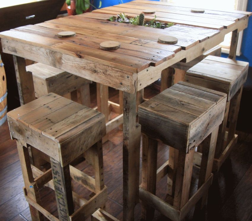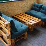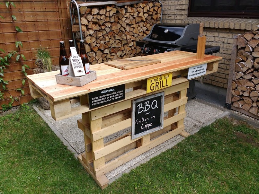 This type garden furniture from pallets like bar counter, constantly in contact with moisture. Therefore, it is advisable to treat the countertop after thorough grinding with moisture-proof impregnation, and then cover it with a layer of transparent varnish or paint it.