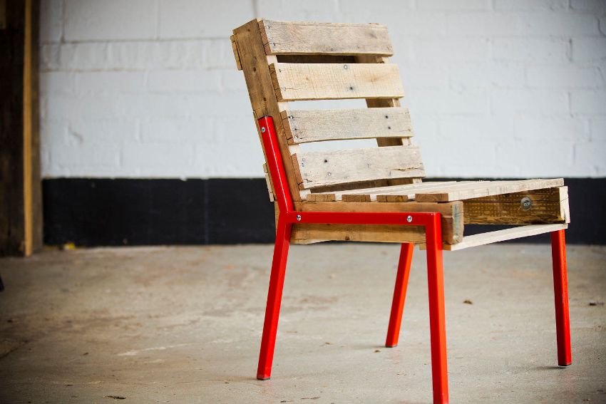 On this, the design options for country furniture from pallets are not limited to. Chairs with straight backs can be made from pallets. The assembly of the side and back walls of furniture is carried out on the basis of boards. They are fixed horizontally on vertical bars from the very bottom. In this case, the back of the chair should be located at an angle of 90 °, and in relation not only to the seat, but also to the armrests.