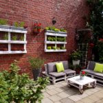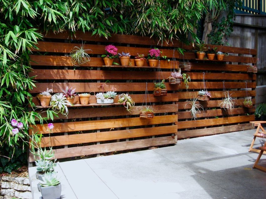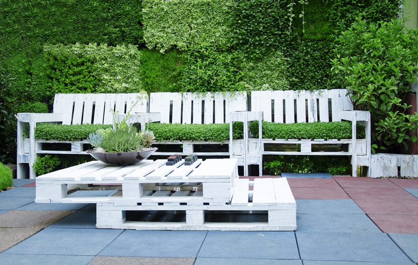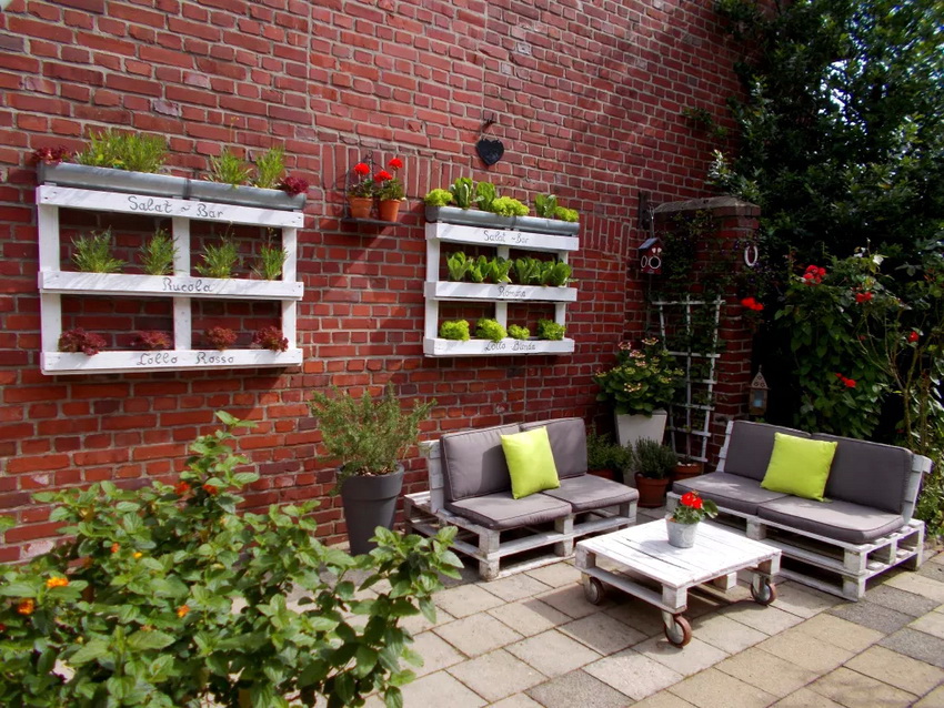 In addition to the bench, flower beds can be made. For this, pallets are placed vertically on a building wall or on a fence. The design of the pallets allows you to place a large number of flower pots that will delight the eye.
