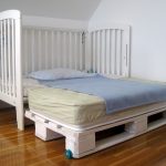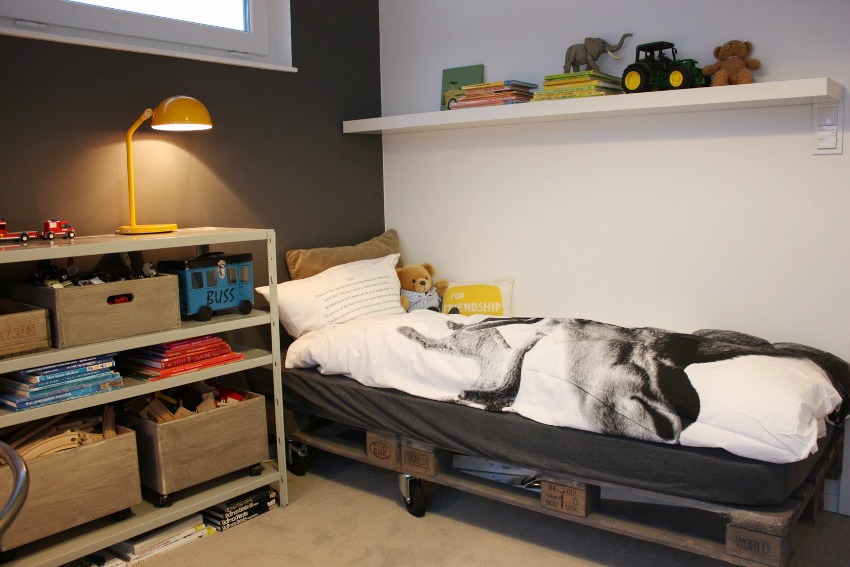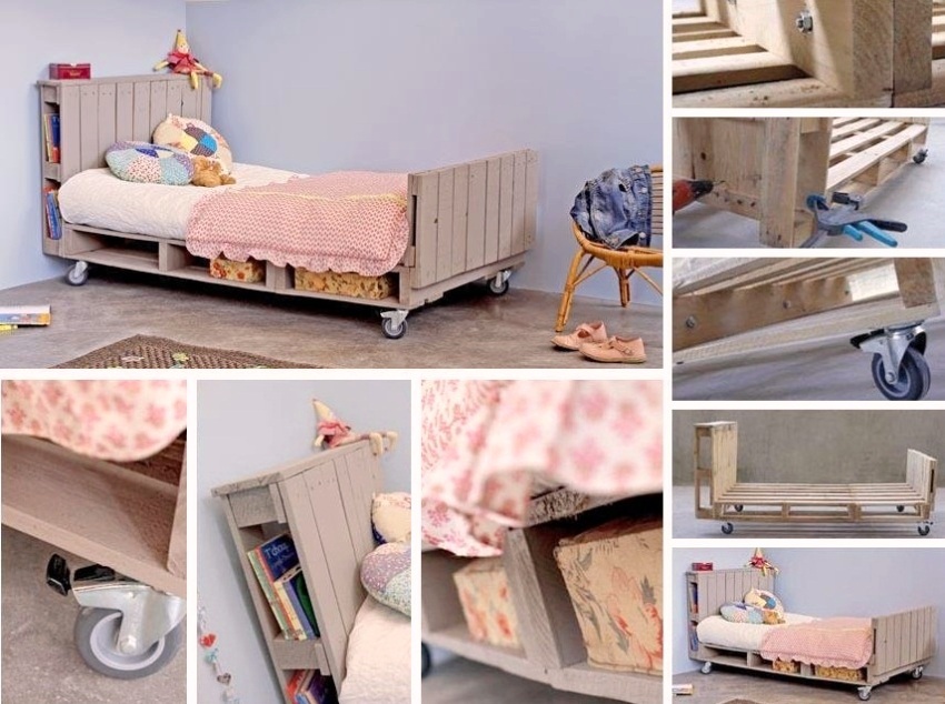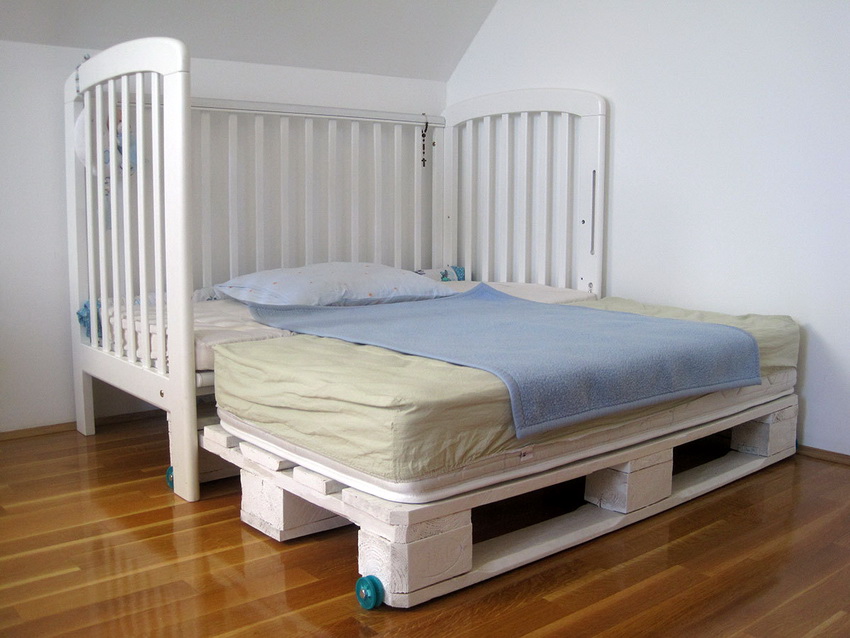 Pallets can be used to create furniture in children's rooms. However, in this case, you will have to carefully approach the choice of building material. Bedmade of pallets will be a great solution if you want to organize a sleeping place for a child in the country. For work, you need 3 pallets, one of them will be disassembled into parts.
