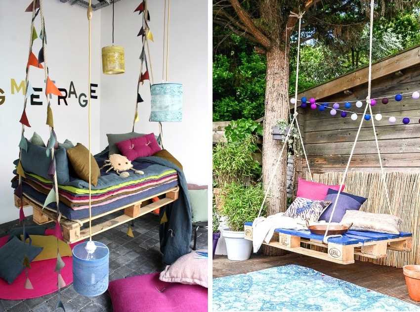 Pallets can be used to create a swing. Moreover, on their basis, it is possible to build structures that will withstand the weight of not only children, but also adults. Such products can be placed indoors, on the veranda or outdoors. They will fit well into any style of interior or exterior of a summer cottage.