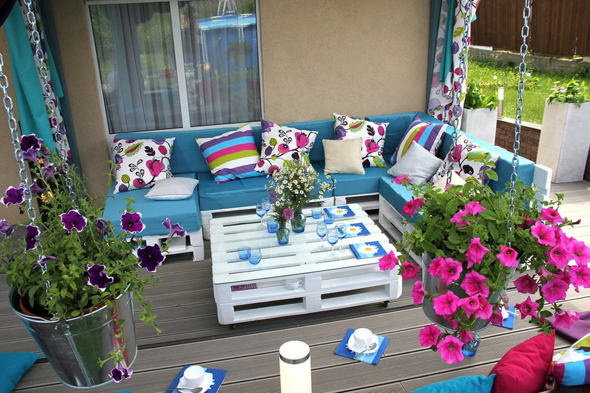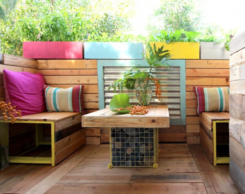 A country chair can also have a more intricate design, for example, in the form of a table surrounded by two benches. It should rise two levels in relation to the seats. To make such a structure, 4 pallets are required.