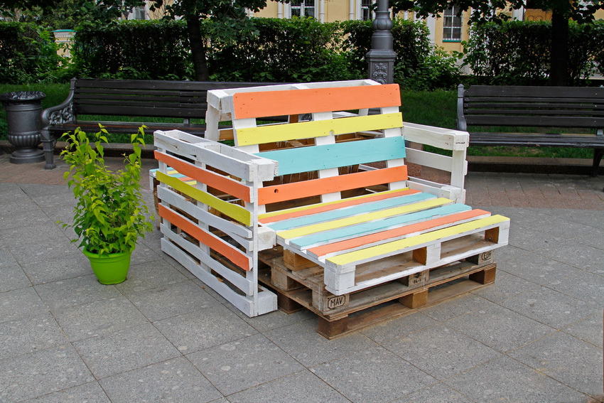 The simplest way to create a garden bench is to take a couple of pallets and fasten them together perpendicular to each other. In this case, one element must be disassembled into separate parts. Some parts will be used to create the legs, others will become stiffeners connecting the back and seat of the bench. If necessary, such a design can be easily disassembled and create something else on its basis.