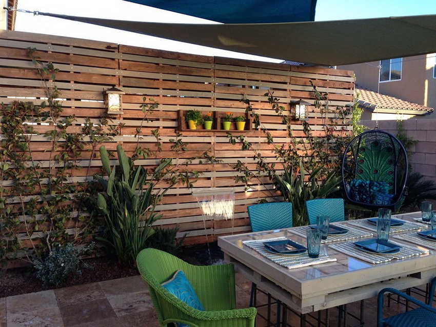 The territory will look attractive if you add a hand-made fence with pallet furniture, photos of such areas sometimes look rude, so it is advisable to adhere to the old style in the design. Other design options are allowed. But in such cases, you will have to decorate the fence with decorative elements, for example, painting or boxes with fresh flowers.