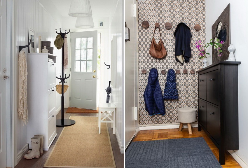 Fully enclosed facades clutter up a small hallway and reduce free space. In this case, it is better to purchase open shelving or hangers that are inexpensive. If desired, it is easy to build them yourself, having the skills and having the right tools. A small hallway with a coat rack is characterized by a minimal number of elements. It is suitable for a small family. In this case, it is necessary that the hanger is equipped not with single, but with double hooks, on which you can hang more clothes.