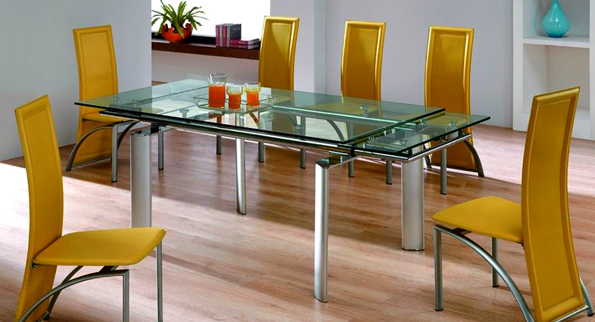 Dining sliding glass tables for the kitchen will help to embody any design idea into reality. Suitable for interiors in loft, art deco, and high-tech genre. They always look original and beautiful. The main thing is to use glass with a high-strength tempered structure in production.
