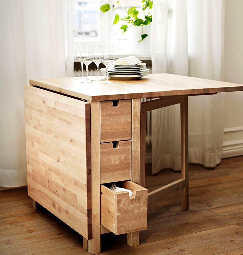 In the last 10 years, the so-called smart apartments with a small area and a kitchen-studio have gained popularity. In such conditions, you have to clearly zone and save space. A compact folding table for the kitchen in everyday life does not take up much space, and on holidays it will expand the circle of guests.