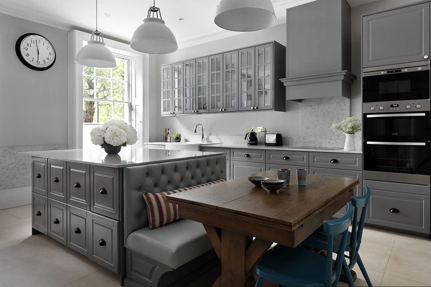 The built-in kitchen table is suitable for any kitchen size. The design of such a product involves not only a place for eating, but also a whole set, in which there are many cabinets, bedside tables and hidden drawers. Features of built-in tables: