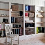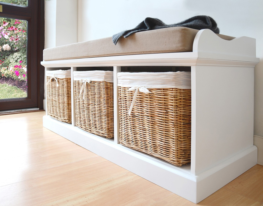 The shelf can be combined with a seat with backrest or coat hangers at the top. The material, painted in muted shades with the effect of burning out in the sun, looks very beautiful and stylish: green, turquoise, brown, lavender, terracotta or white. Very often in the design of Provence-style rooms, open shelves in the form of wicker boxes are used for storing shoes.
