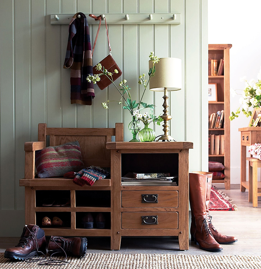 Country is a simple country style (just like Provence). The main feature of this direction is the use of natural materials in a natural wood range, but the use of bright colored furniture is also allowed. Shoe storage products can be rough, have a rough surface and not too straight lines.