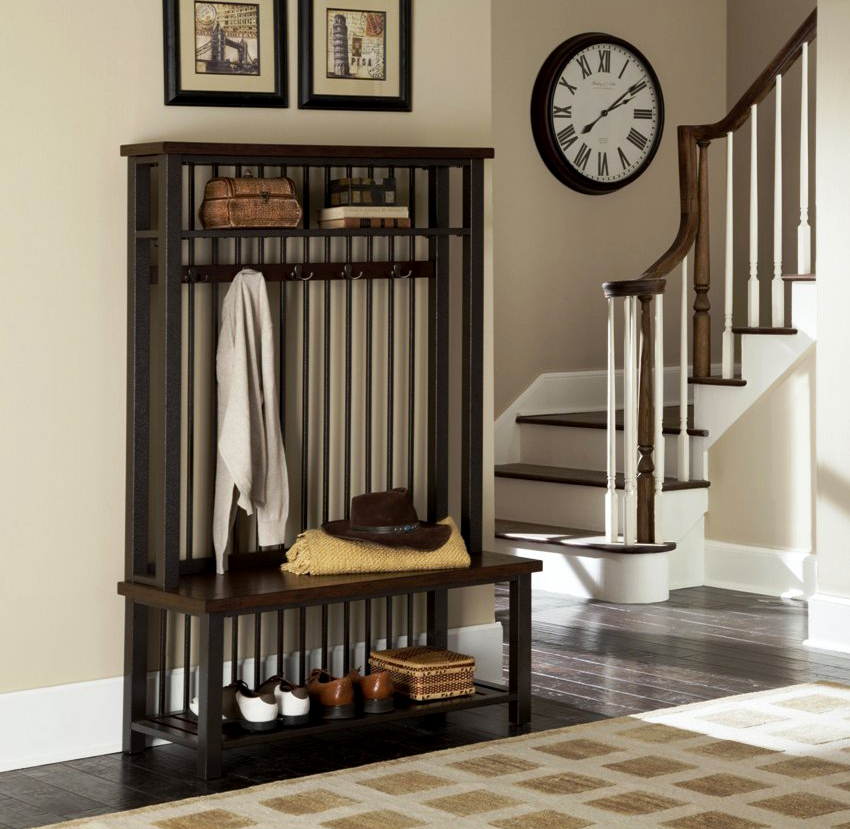 A wooden shoe rack is a reliable structure that must be treated with a special substance that protects against moisture and sudden temperature changes when opening the front doors. The metal shoe rack looks original and harmonious in combination with wood and textile elements.