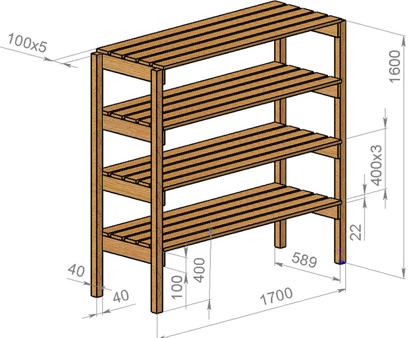 Then the racks are made. Planks 80 cm long are prepared. Then cuts are created (at a distance of 25 cm). Their depth should correspond to the thickness of the timber. In total, four racks are needed, into the cuts of which already made shelves should be inserted. The bottom shelf is set at a height of 25 cm from the floor, and the upper part should not reach the top edge of the uprights by about 10 cm.