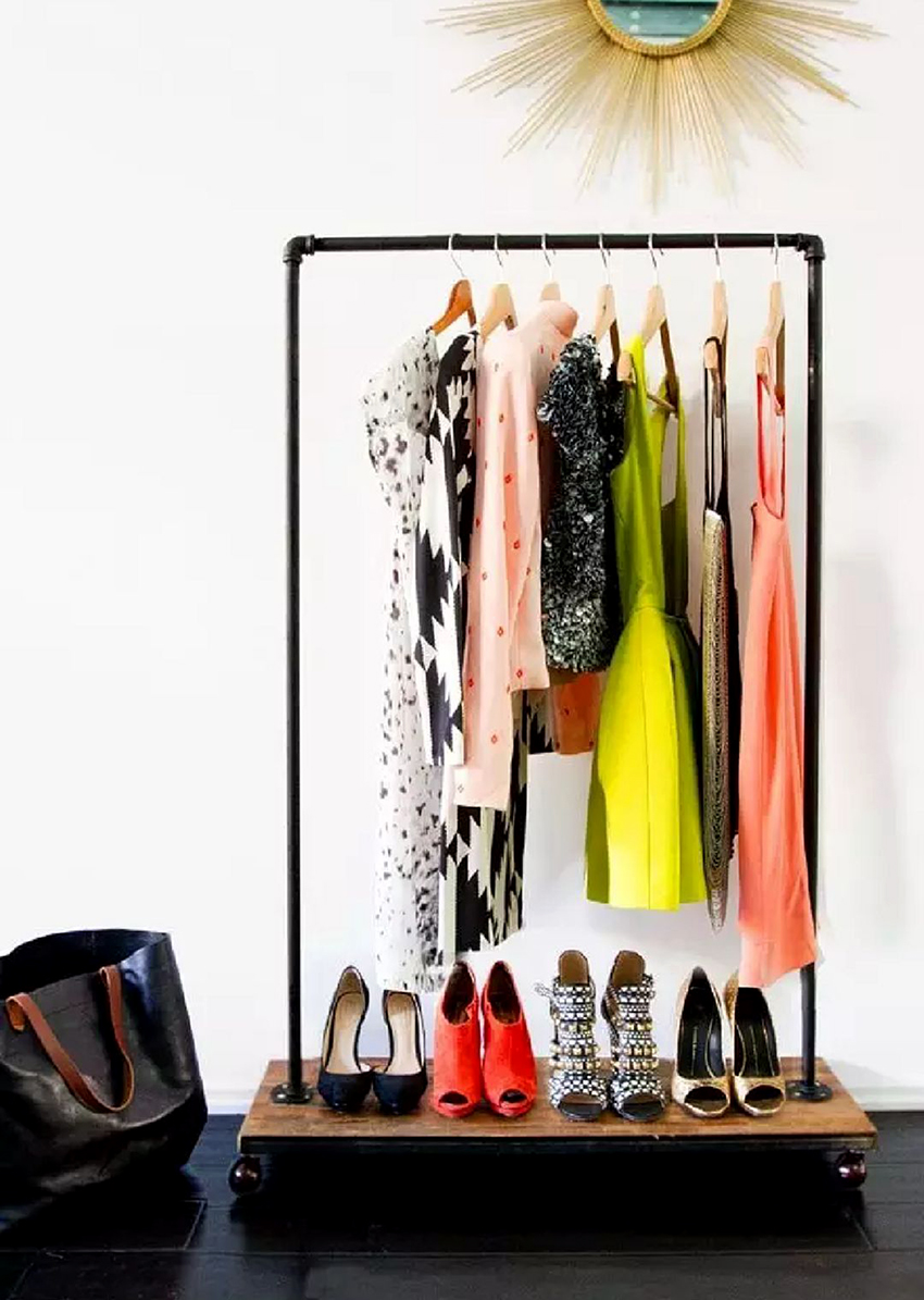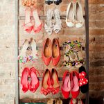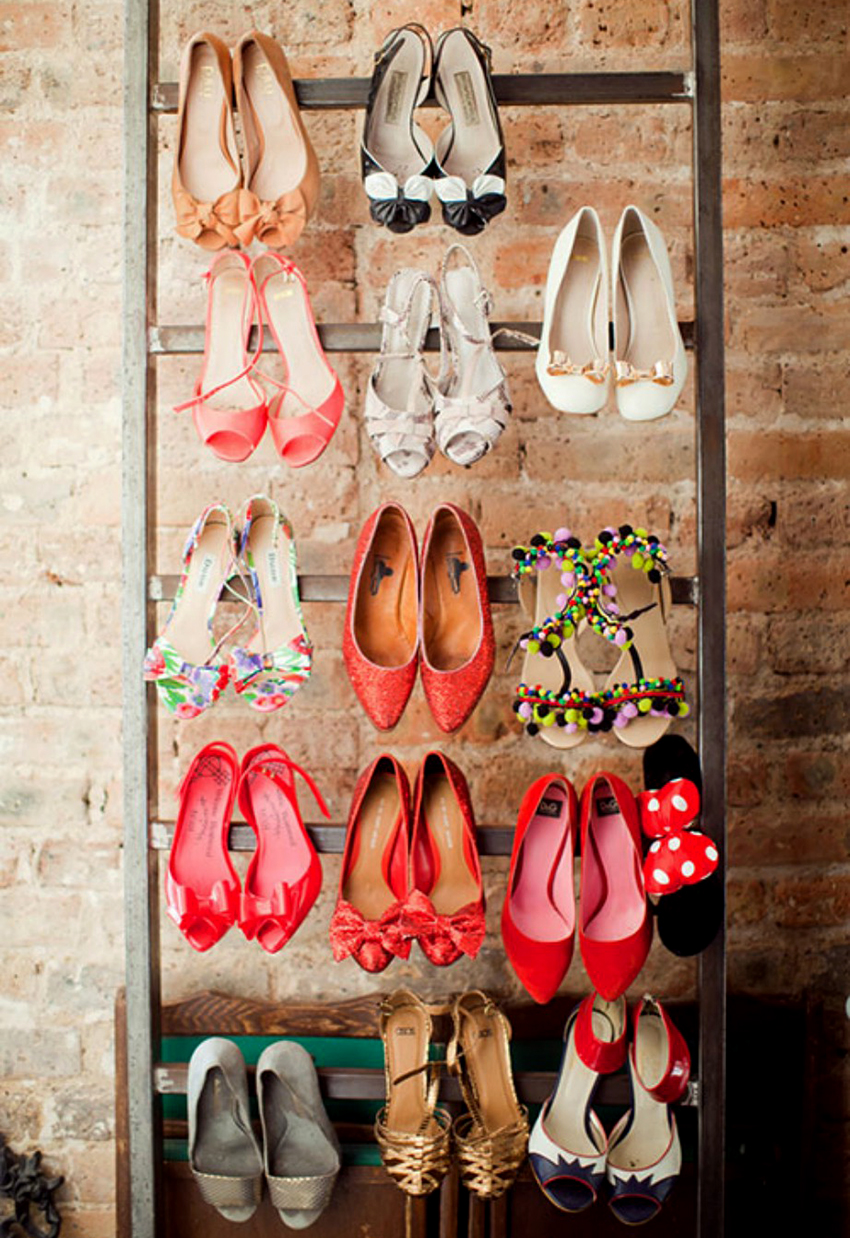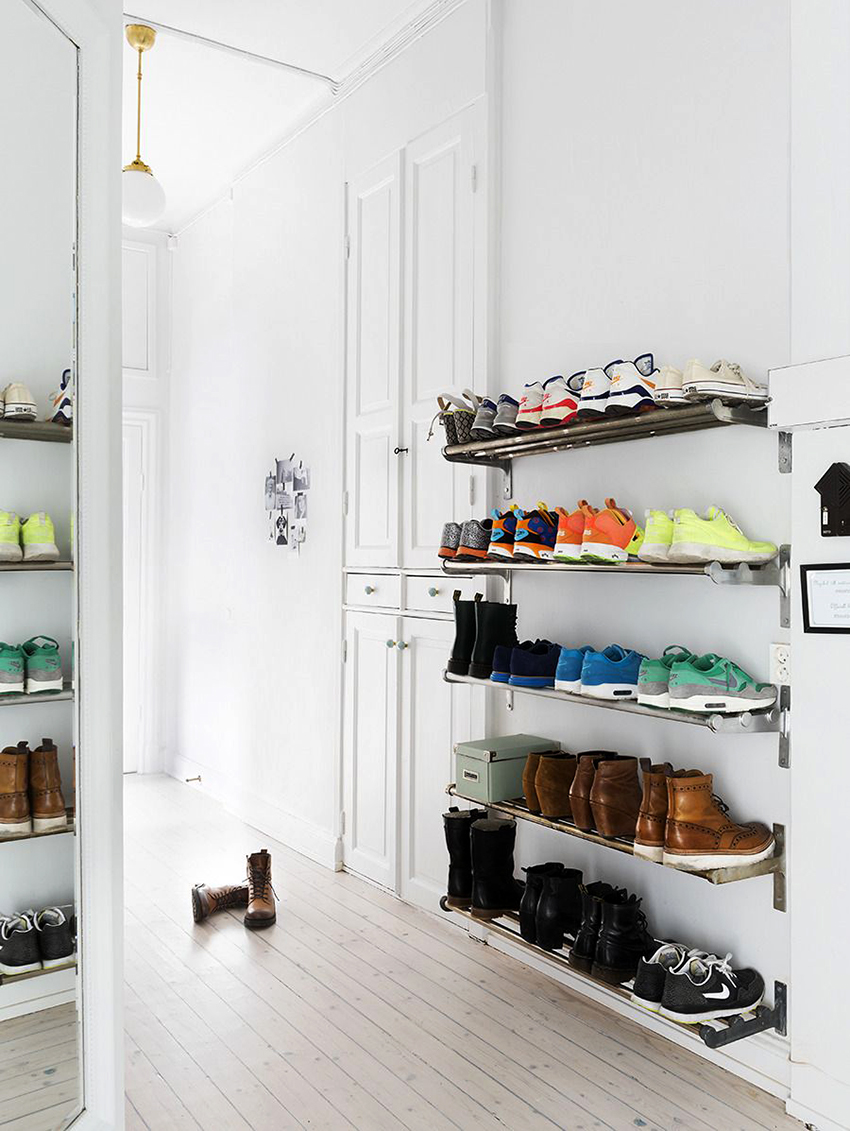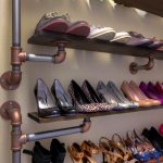The main problem of apartment premises is the lack of space. One of the methods of saving space and optimal storage of women's shoes with thin heels is to use a metal pipe. To do this, a long handrail must be attached at a distance of 5 cm from the wall. In this case, the shoes will be held by the heel. If you design such a shelf beautifully, then the design will look very original.