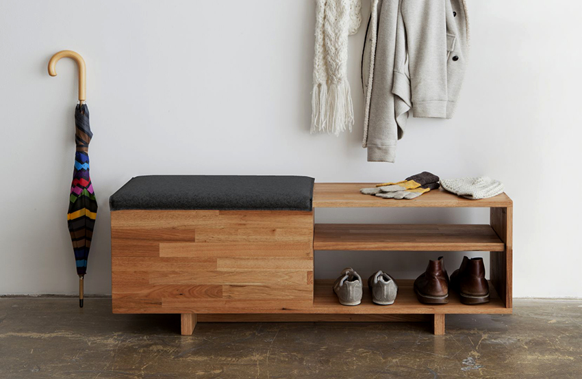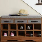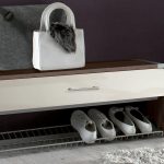 A shoe rack with a seat in the hallway is a small fixture with a soft seat on top. This design can be with or without a back, it often looks like an ottoman or a small bench. Very often, the product does not have doors and drawers, and all shoes are stored in an open position. Such a device can be supplemented with a hanger, a small bedside table for storing small items or a phone stand. This model is very easy to use and looks stylish and beautiful in the hallway.