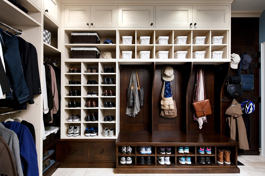 Very often, in addition to individual devices for storing shoes in the hallway, there are models built into the closet, or modular designs with an already mounted shoe rack. Pull-out mesh shoe racks in the closet are a unique solution for convenient storage of shoes in a closet or dressing room. Such systems save space.