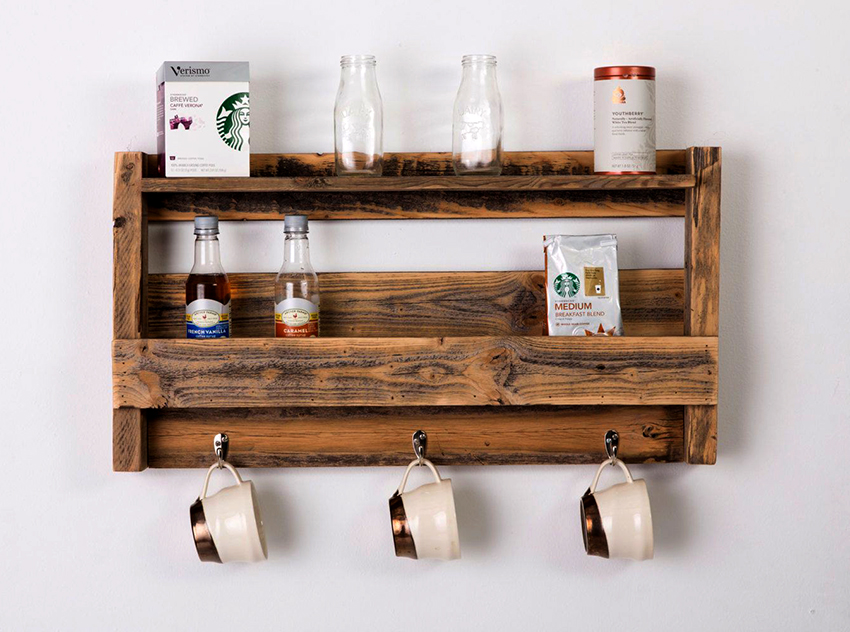 Then you need to cover the surface of the pallets with a coloring compound or varnish. Thus, the shelf is processed in the hallway. The easiest way to do this element of the interior with your own hands. After the paint has dried, place the pallet against the wall. If desired, such a structure can be additionally decorated by drawing a drawing on it.