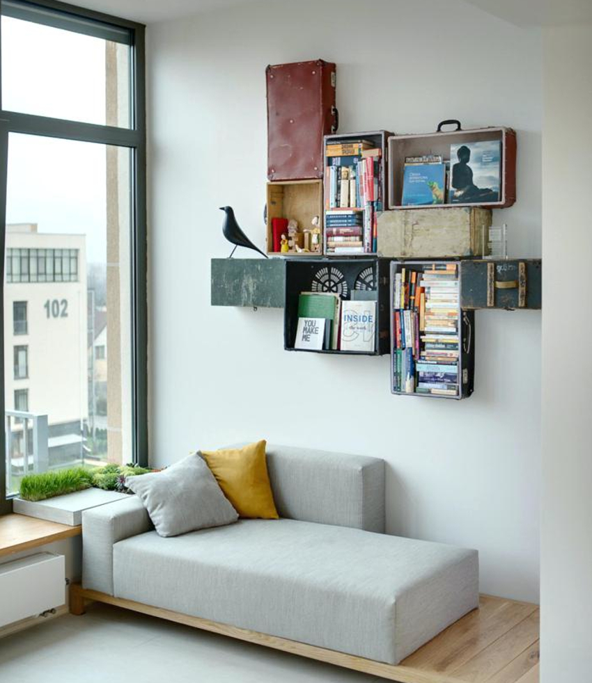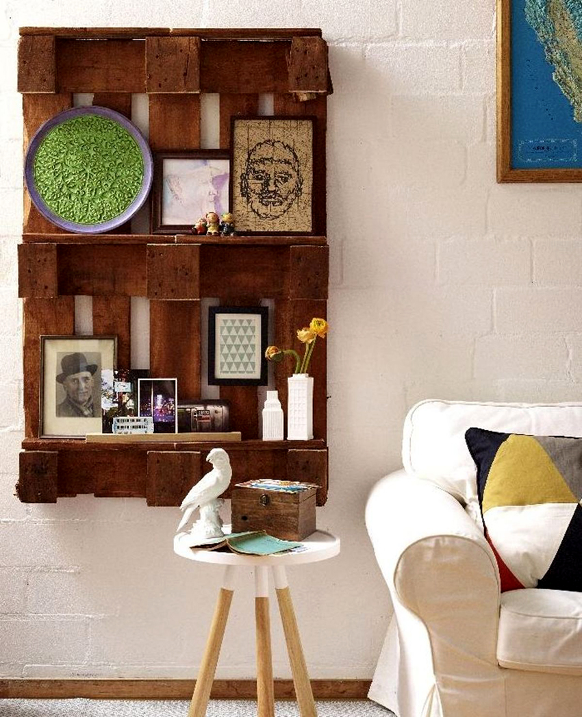 In modern design, there is a very popular material - building pallets. They are used to construct not only shelves, but also other, more complex furniture elements (for example, sofas). Pallets can be purchased very cheaply or found at a nearby construction site.