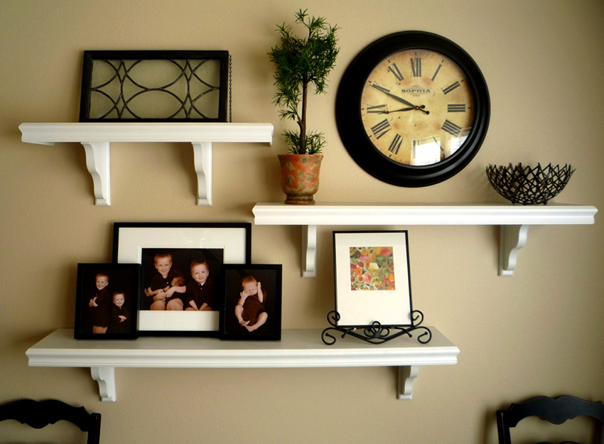 - 16 Features of the decor of wall structures: how to decorate the shelf