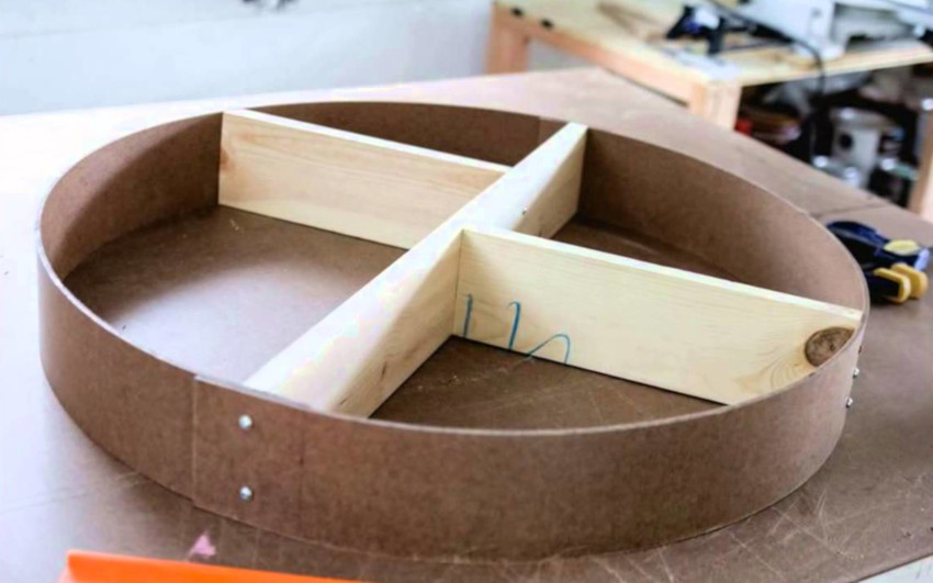 The next step involves direct assembly of the structure. The whole process consists in fixing the wooden segments together with self-tapping screws.