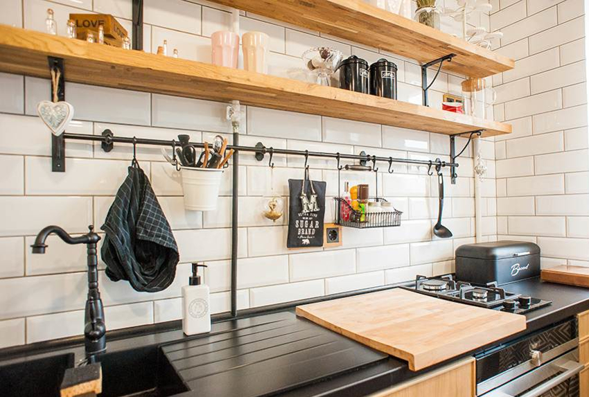 Shelves in the kitchen the entire length of the working surface can replace the upper tier of cabinets
