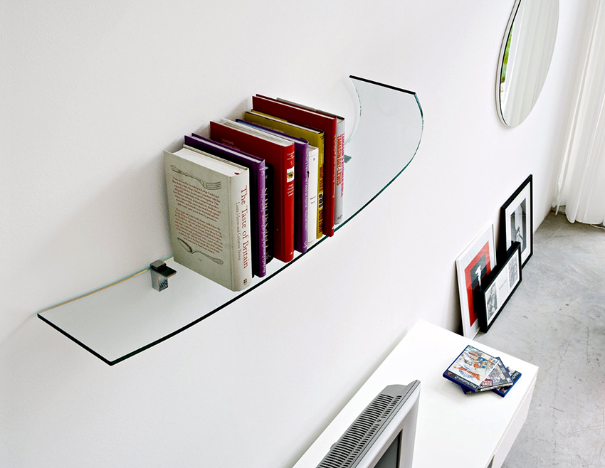 Glass. It is used when it is necessary to decorate the interior of the room in a modern style. It goes well with cold tones: white, gray and black. It is much more difficult to make shelves from glass material than from wood. In such a situation, you will need to purchase a special tool for cutting glass and master the basics of working with it.