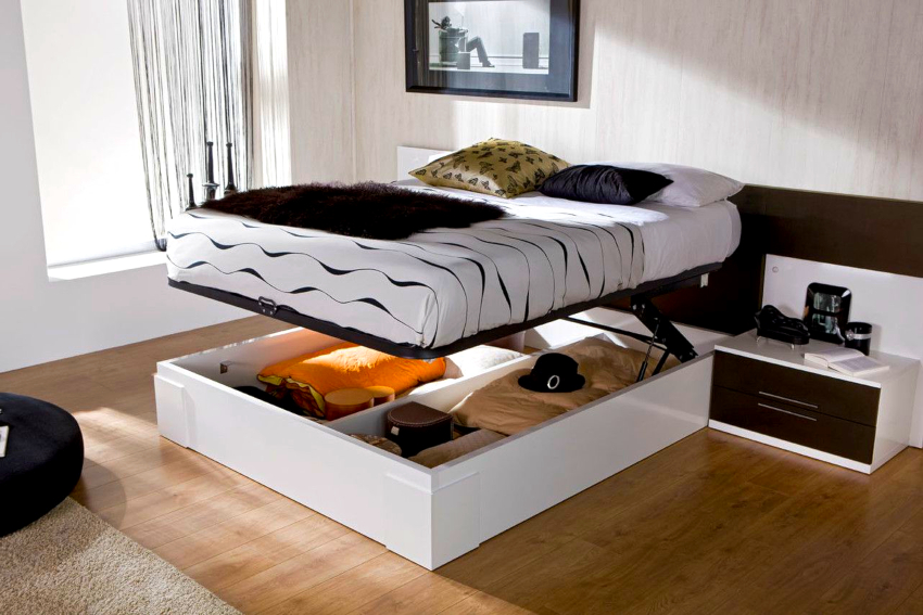 Usually in small apartments it is recommended to place beds that are equipped with a lifting mechanism or built-in drawers (in small quantities). In a hidden space, you can easily place things that are not often used, as well as bedding or winter preparations. When organizing such a mini-pantry, one should not forget that the main purpose of the bed is a comfortable sleep. Depending on the model, the height of the bed with the mattress from the floor can have the following dimensions:
