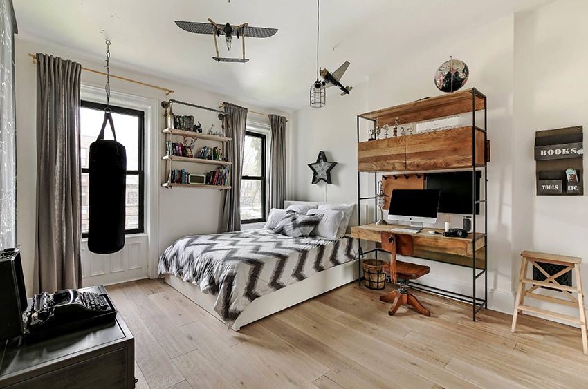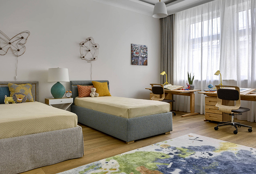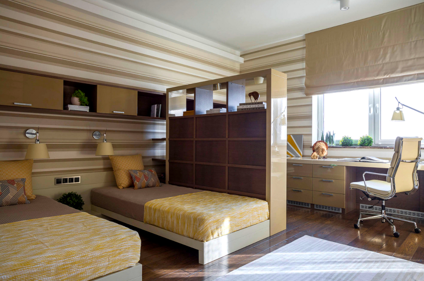 To save space in the nursery, bunk beds are often installed, the dimensions of which allow the use of the bedside space to install an extra bed, a wardrobe or a table for doing homework. This design is quite suitable for a schoolchild and is considered safe.