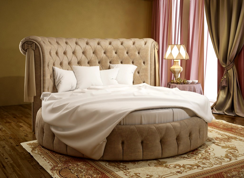 - A round bed, which is considered the most popular among non-standard shapes. Here it should be borne in mind that the size of a single bed corresponds to a diameter of 2 meters, and a one-and-a-half product can be replaced with a round bed, the diameter of which is 210 cm.