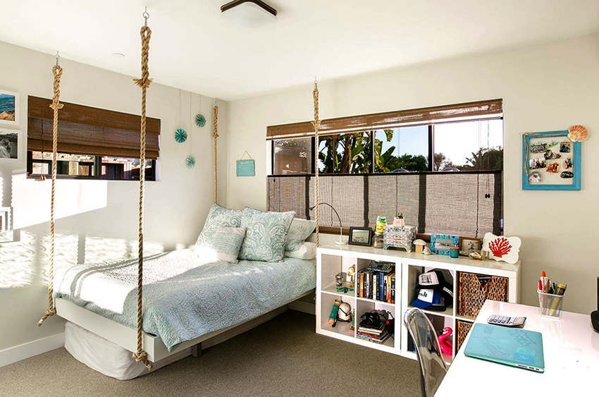 - Suspended model. To create such an option, a single bed with parameters 80-100 cm is more suitable, or a small lorry up to 140 cm wide, the length in this case is not very important. The main disadvantage is that the bed loosens quickly. Attached to the wall with cables, ropes or chains.