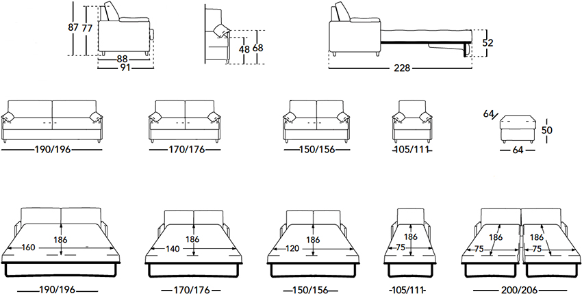 Standard sizes of sofas with the Eurobook transformation mechanism