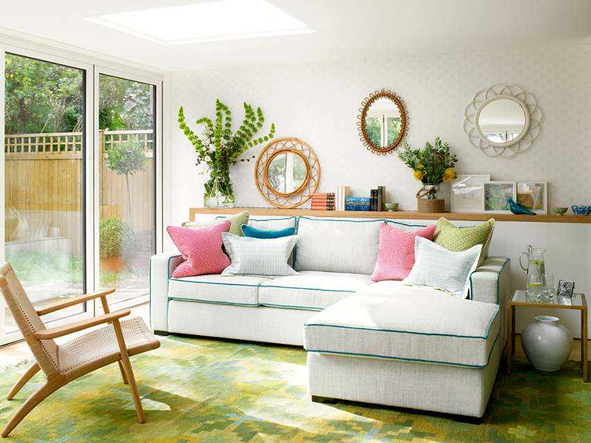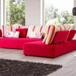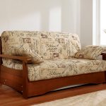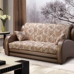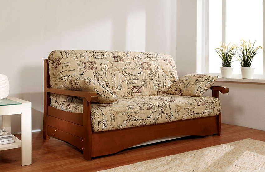 Such sofas are also distinguished by some design features. As a rule, armrests are made of wood or metal. The furniture looks stylish, not bulky. Sometimes the armrests are replaced with side cushions, which are comfortable to lean on or lie on. The upholstery for sofas is motley ("newspaper", abstraction, floral motifs), which gives the products a special originality.