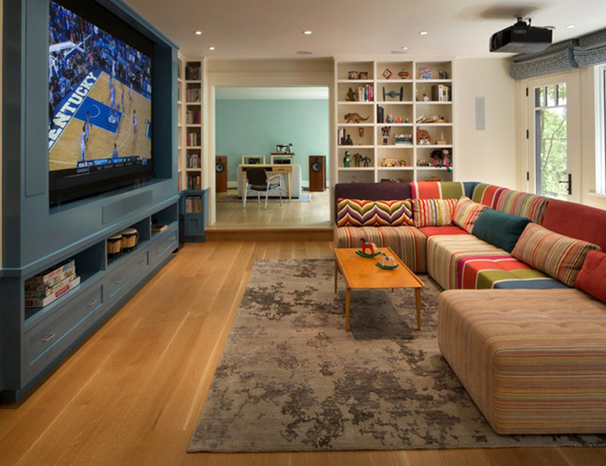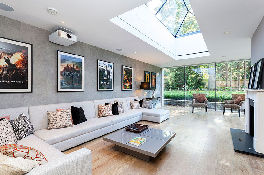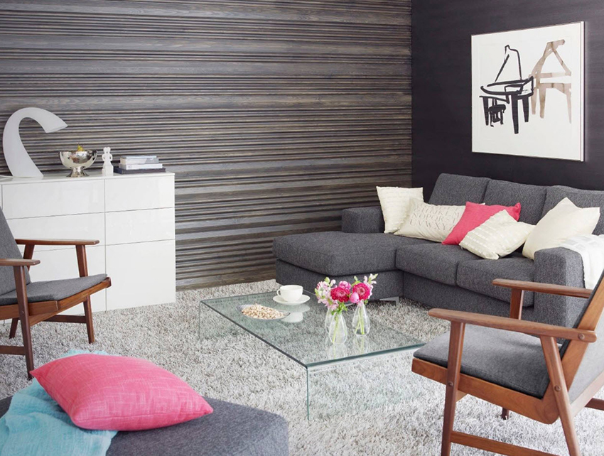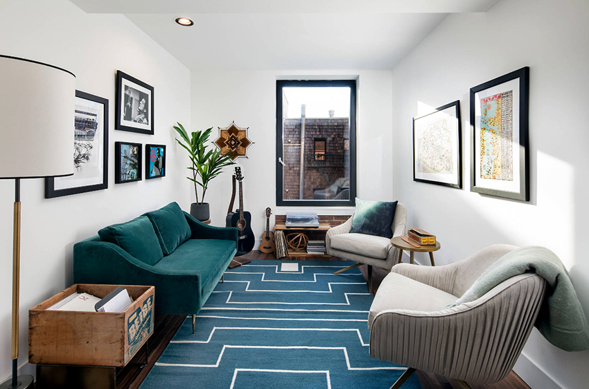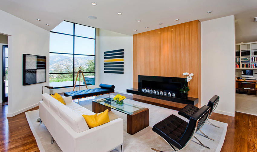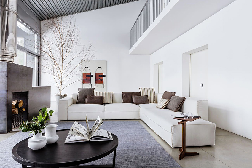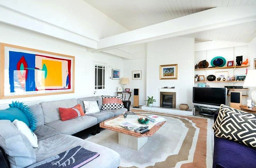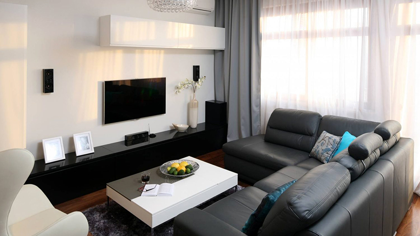 In a rectangular living room with a large difference in sides, you should not purchase an angular structure. More acceptable are two identical straight sofas 180-190 cm long and 80-90 cm wide. They can be installed in parallel (if the area of the room allows) or in an L-shaped way with a mandatory free space at the place of the conditional connection.