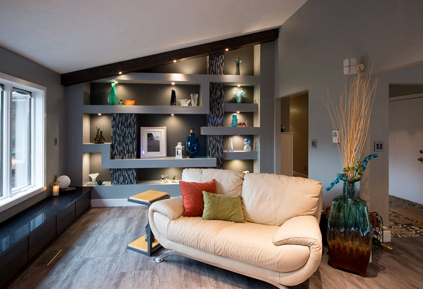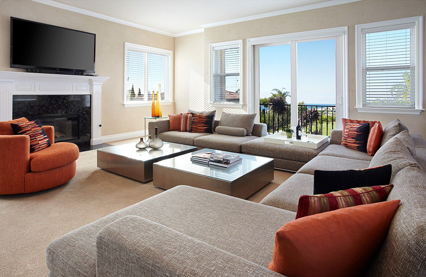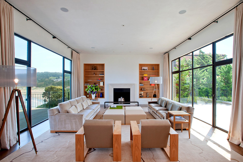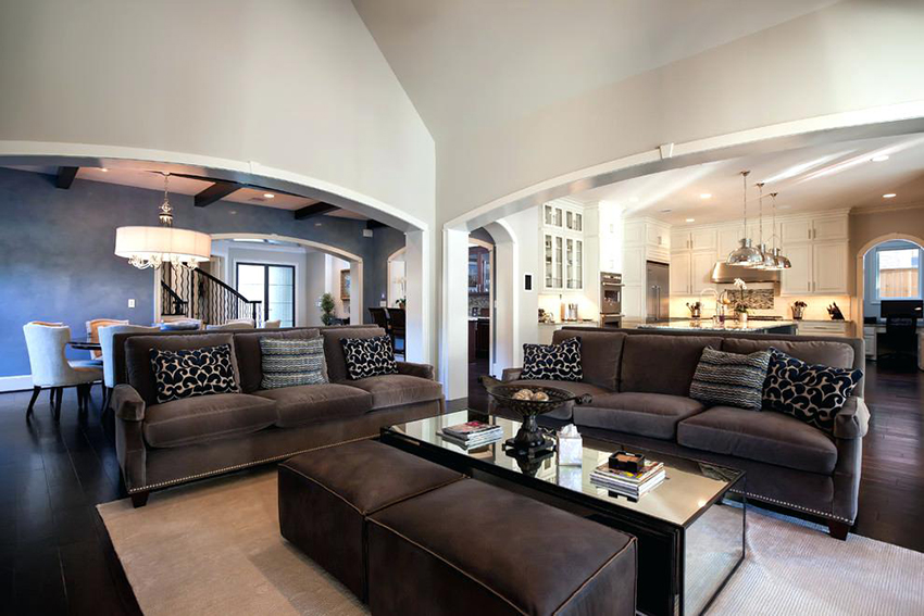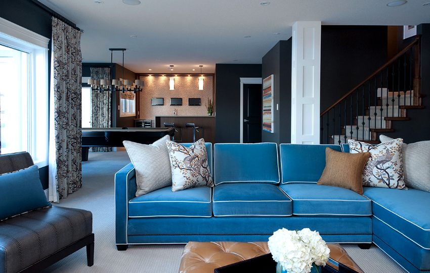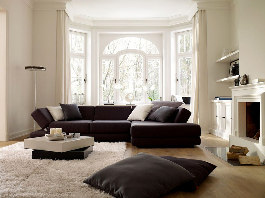 U-shaped sofas for the living room are especially luxurious and attractive. These are options for larger rooms only. In this case, the distance between the parallel sides should be such that a table can be placed inside the sofa structure (if it is absent or installed outside the sofa, it will not work to equip a comfortable seating area).