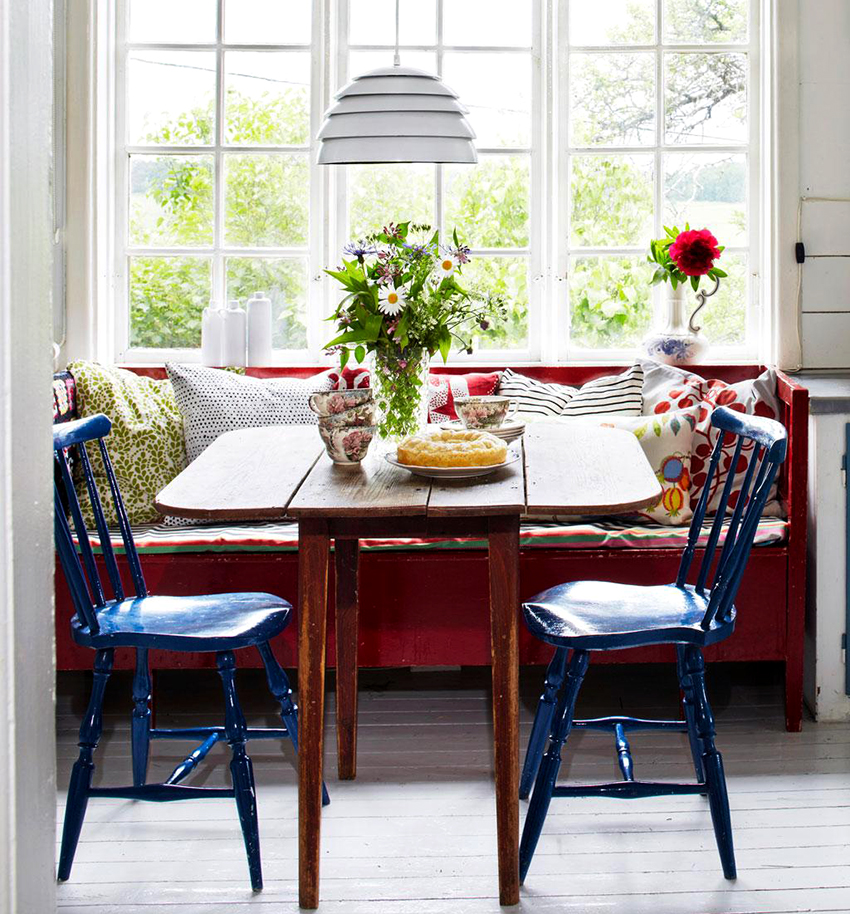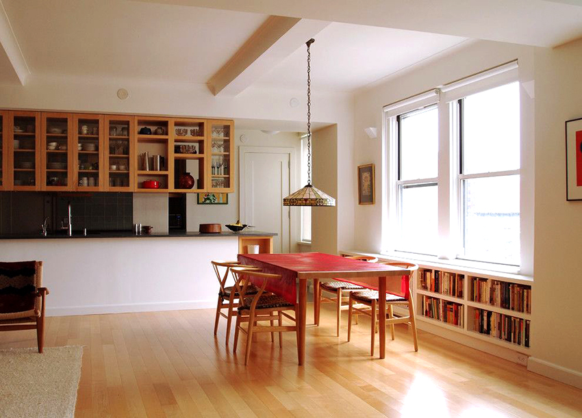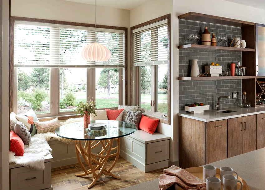 The square table significantly saves free space. This is the best option for a small kitchen or kitchen-living room with a dedicated dining area. A table in the corner is the best option for a family of two. In addition, such an arrangement will make it possible to rationally use the corner zone, to make it functional, while not overloading the space. If placed in the center of the room, four persons can sit comfortably behind it.