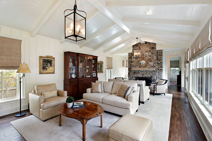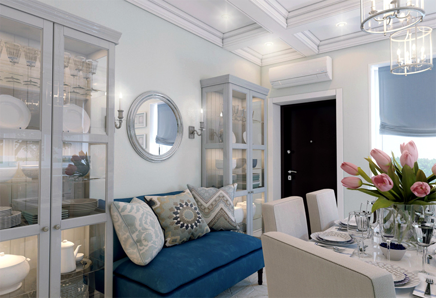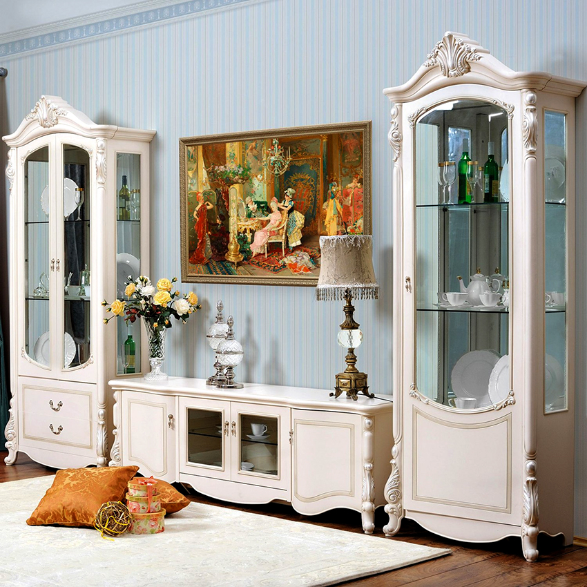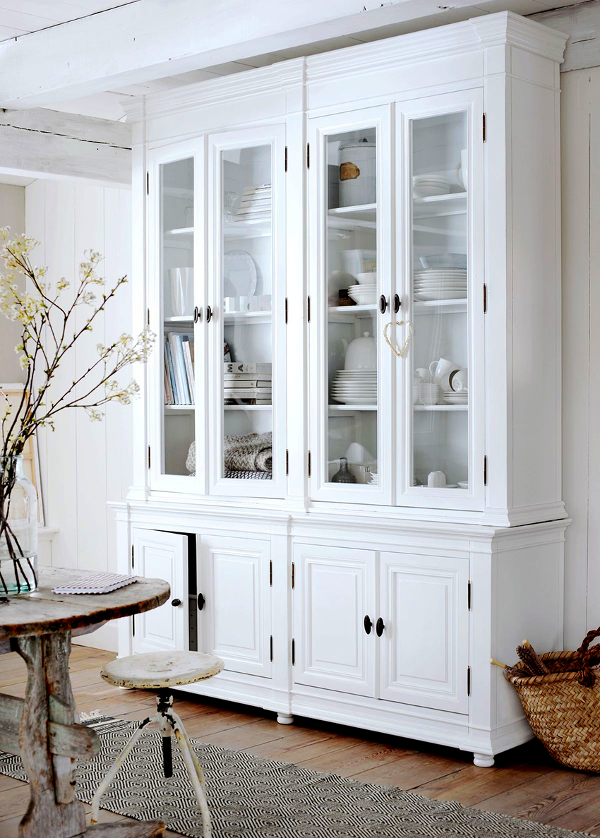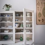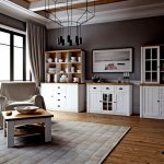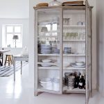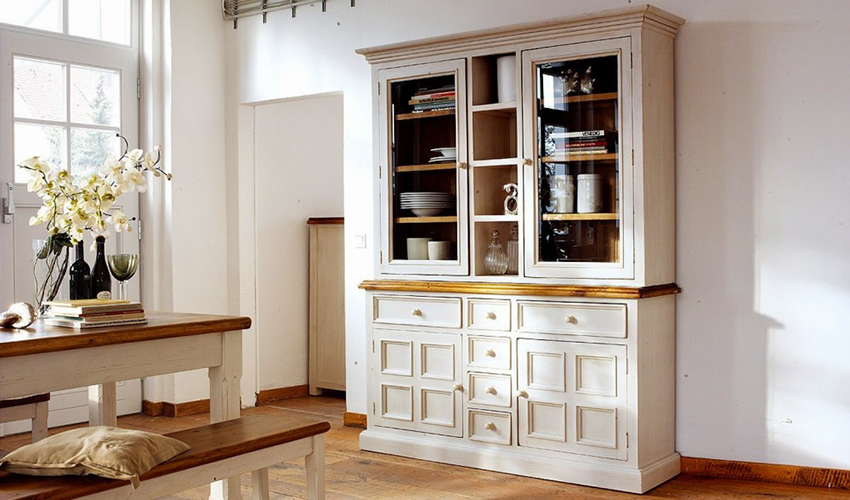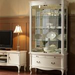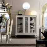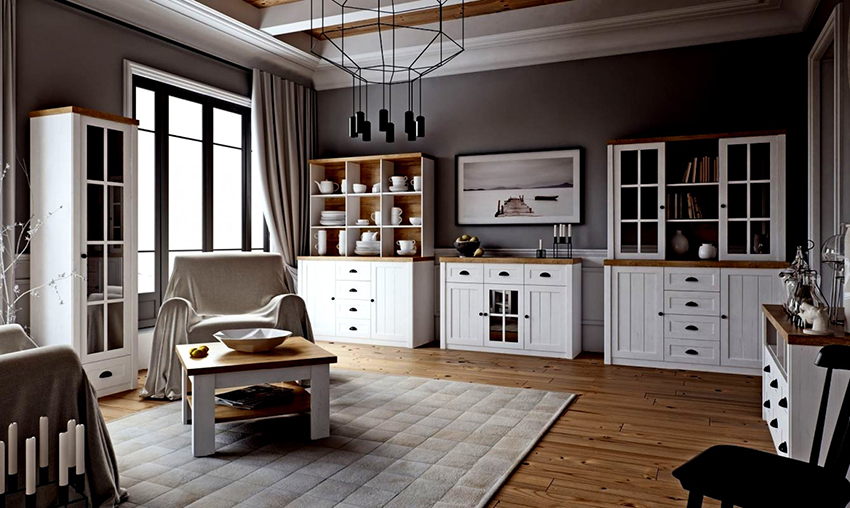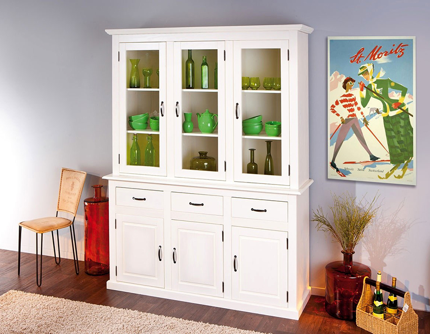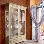 For living rooms in Provence, Scandi and Shabby chic styles, you should choose a sideboard for dishes in light colors. An excellent option for a spacious living room is a tall white wardrobe with glass doors and many shelves. For a small room, it is best to choose a small corner sideboard with one door.